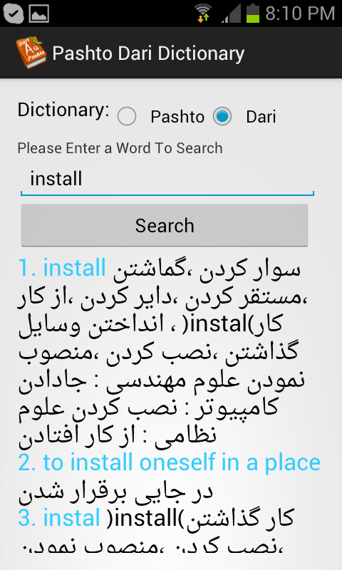 Dict Box - English to Pashto Dictionary & Translator. Includes more than 100K words and expressions Easy to use, fast, works offline.